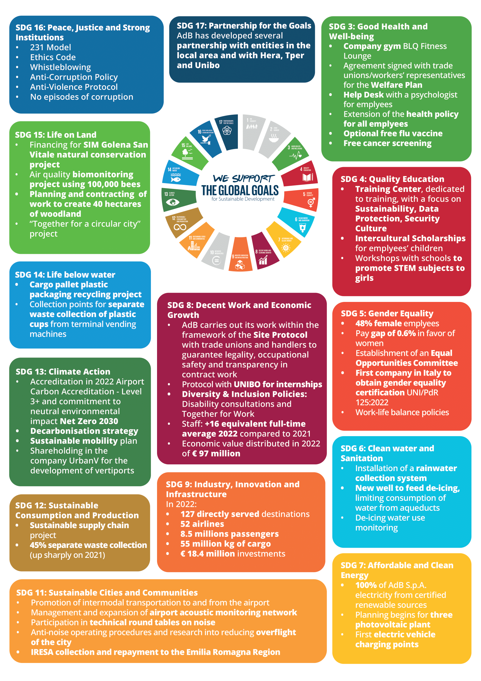The AdB Group is committed to meeting these targets on a daily basis, monitoring interactions between results for the year 2022 and the Sustainable Development Goals, as identified below: