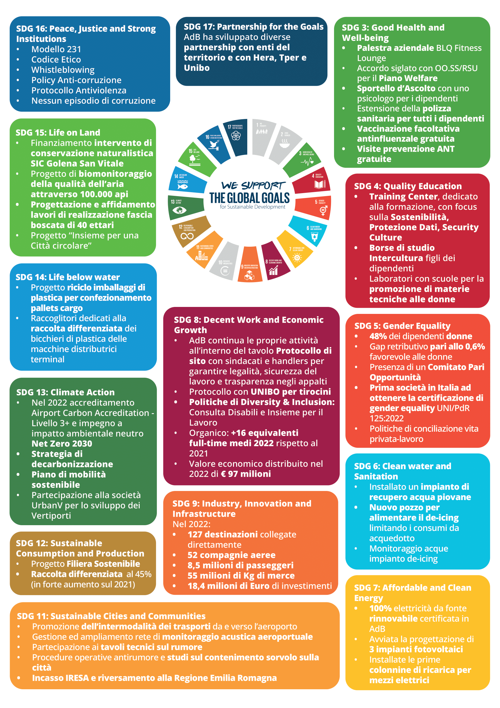 Il Gruppo AdB si impegna quotidianamente ad operare in coerenza con questi obiettivi monitorando, come di seguito, le interazioni tra i risultati raggiunti nel corso del 2022 e gli Obiettivi di Sviluppo Sostenibile: