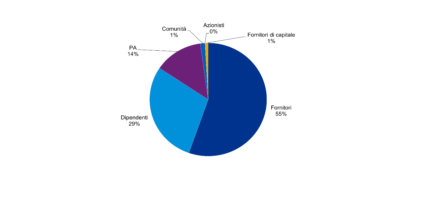 Nel 2022 il valore economico distribuito dal Gruppo è stato ridistribuito ai diversi stakeholder del Gruppo nelle seguenti percentuali: