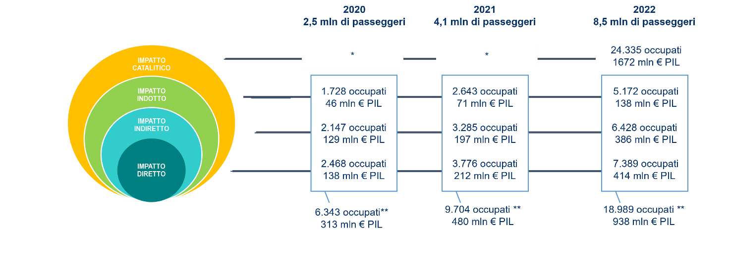 Utilizzando il modello “Economic Impact Online Calculator” predisposto da ACI Europe, sulla base dei dati di traffico quali driver principale, è possibile stimare in via teorica la ricchezza e l’occupazione prodotta dagli aeroporti, secondo questa classificazione: