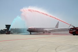 La novità è stata festeggiata oggi all’Aeroporto di Bologna, in occasione dell’arrivo e della successiva partenza del primo volo American Airlines, con diverse iniziative: i fiori offerti alle hostess del volo in arrivo, un concerto di musica “bluegrass” (il country del sud-est degli Stati Uniti) in corrispondenza del check-in del volo, il taglio del nastro e la torta offerta ai passeggeri al gate di imbarco. Le celebrazioni si sono concluse con il “water cannon salute” (o battesimo dell’acqua) al volo in partenza con i mezzi dei Vigili del Fuoco, durante il quale American ha voluto stupire i passeggeri del volo, i membri del team e dello scalo aggiungendo all’acqua due coloranti alimentari, uno rosso e uno blu, per un effetto scenografico in perfetto tono con la livrea della compagnia.