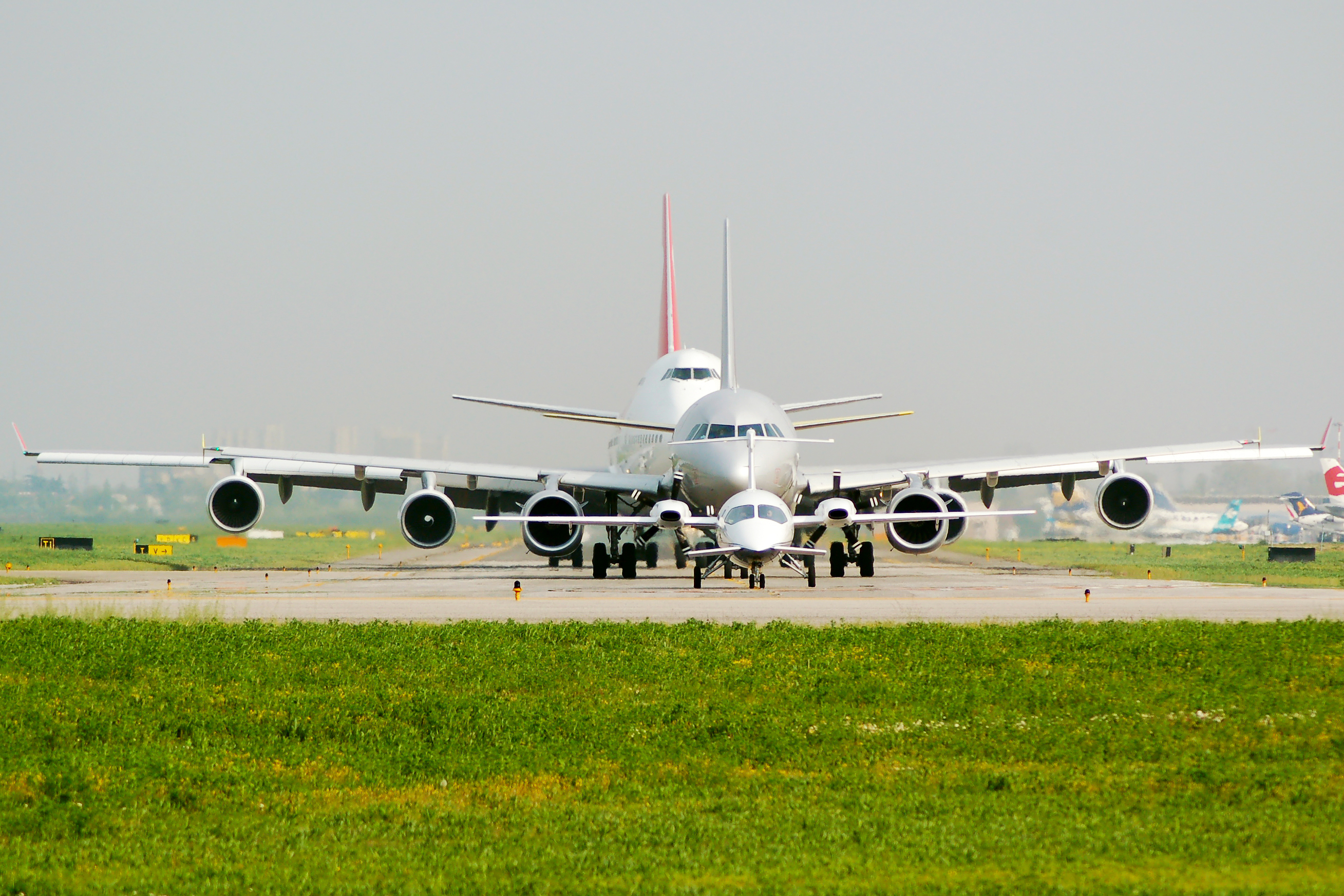 Foto di aerei di diverse dimensioni in fila per il decollo